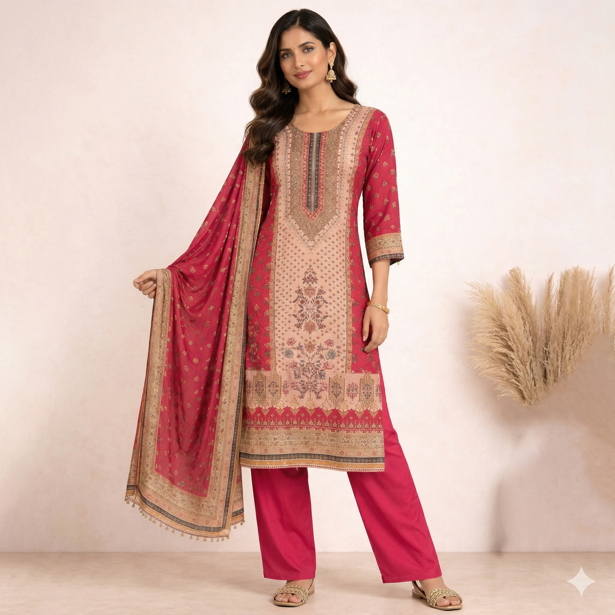 Step into refined ethnic style with this beautifully crafted pink Pakistani suit from Sukam Sutra. Designed for modern women who appreciate timeless silhouettes, this ensemble blends soft femininity with intricate detailing.